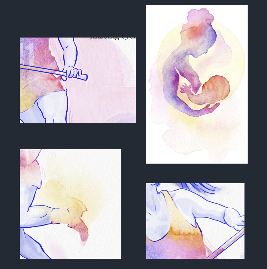 I wanted to pull readers in from the start of the article. In earlier versions (the top two sketches below), the glitchy geometric shapes and soft watercolor clashed. With more iterations, I started to leaned fully into the idea that “circle = cycle”, which developed to the final version (bottom right), showing a healthy cycle that glitches to a disrupted cycle.